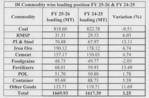 During 2025–26, Indian Railways carried a record 1670 Million Tonnes (MT) of freight, registering a growth of 3.25% over the previous year. This strong performance was complemented by a 4.56% increase in the number of wagons handled, which rose from 2,79,12,271 in 2024–25 to 2,91,86,475 in 2025–26. The steady rise in freight loading highlights the increasing demand for reliable, cost-effective, and efficient logistics solutions, positioning Railways as a preferred mode of transport for bulk commodities.