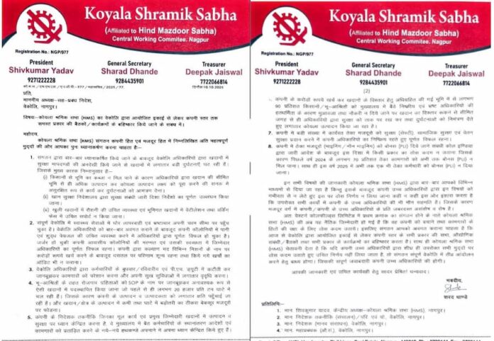 कोयला श्रमिक सभा जनरल सेक्रेटरी शरद धाण्डे ने इस आशय का पत्र डब्ल्यूसीएल के सीएमडी को लिखा है। पत्र में बताया गया है कि प्रबंधन खदानों में सुरक्षा मापदण्डों की निंरतर अनदेखी कर रहा है। जबकि कोयला श्रमिक सभा द्वारा बार- बार इस ओर ध्यानाकर्षित कराया जा रहा है।