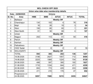 नागपुर, 24 अगस्त। वेस्टर्न कोलफील्ड्स लिमिटेड (WCL) में यूनियन सदस्यता सत्यापन 2025 को महाराष्ट्र में पहला चरण पूरा हो गया। हिंद मजदूर सभा (HMS) इस बार रिकार्ड बढ़त की ओर नजर आ रहा है।